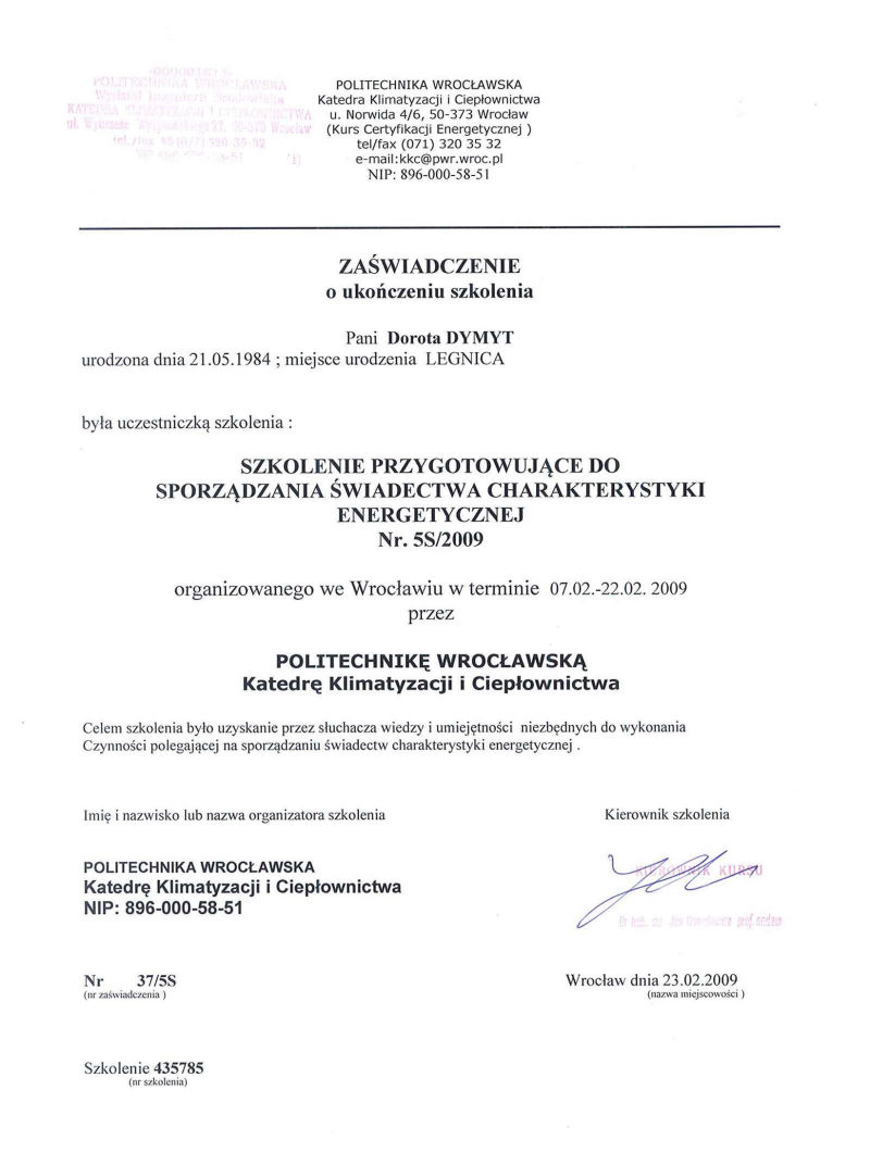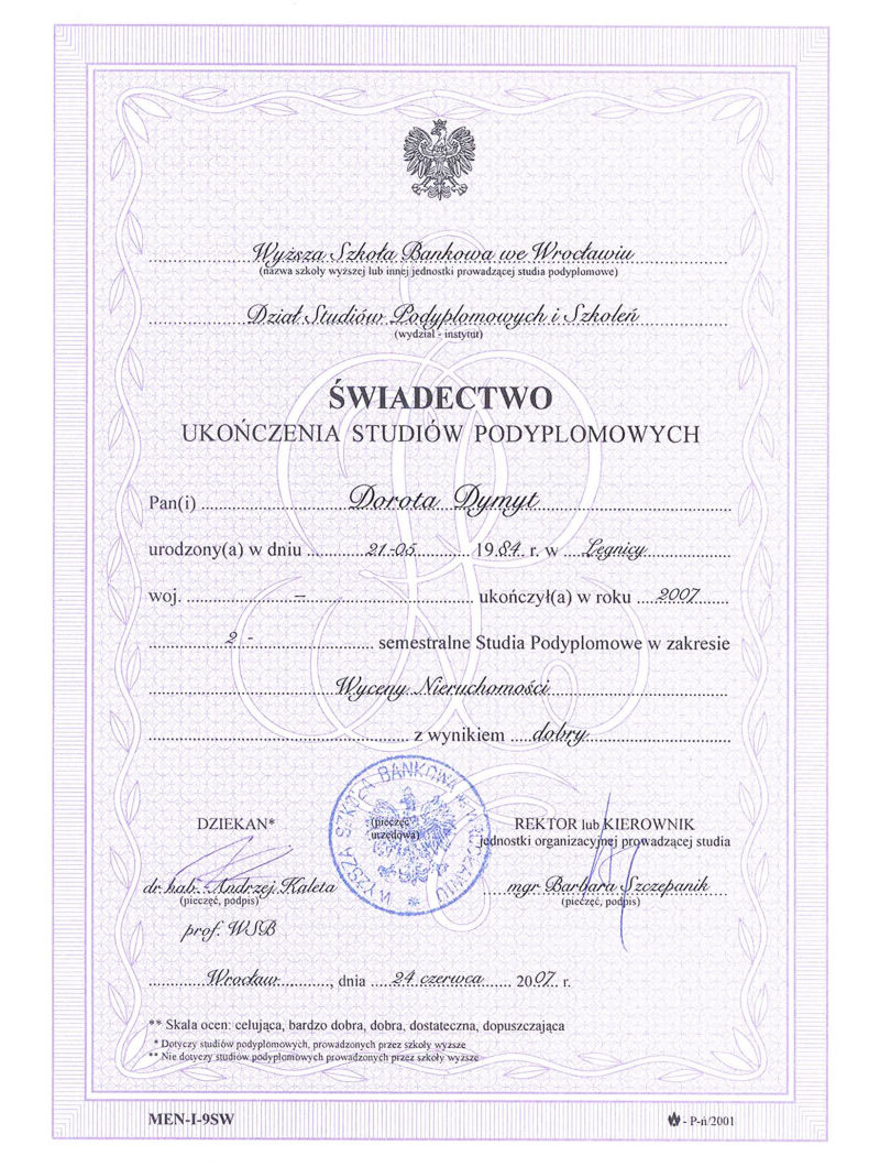 Absolwentka Szkoły Głównej Handlowej w Warszawie na kierunku Studia Menadżerskie dla Deweloperów. Ukończyłam wydział Prawa, Administracji i Ekonomii Uniwersytetu Wrocławskiego.