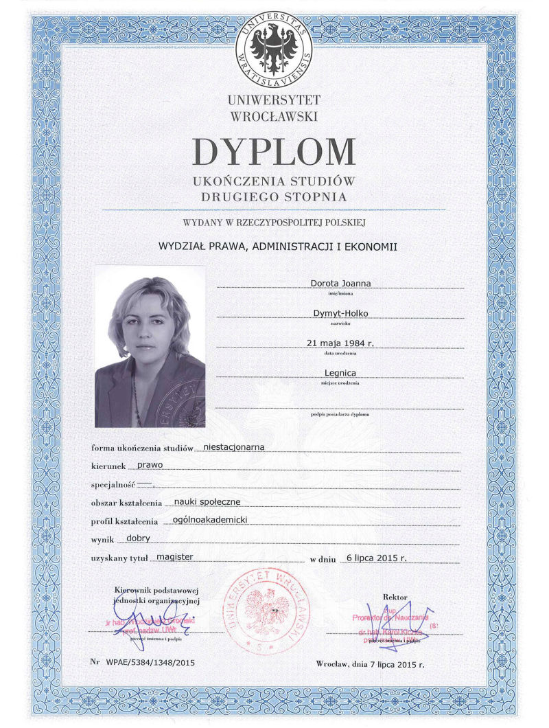 Studentka studium doktoranckich na kierunku prawo – Uczelnia Łazarskiego w Warszawie.